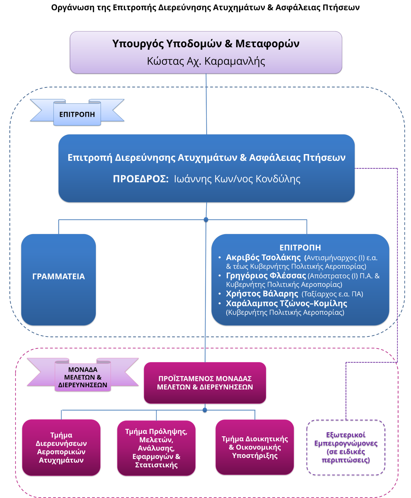 Οργάνωση και εκπαίδευση ομάδων διερεύνησης. Εκπόνηση διαδικασιών διερεύνησης αεροπορικών ατυχημάτων και συμβάντων. Παρακολούθηση και ενημέρωση σχετικά με τους κανονισμούς που διέπουν την Πολιτική Αεροπορία (ΥΠΑ, σχετικά Annexes, Documents του ICAO και σχετικά JARs). Αναλύσεις, τεχνικές έρευνες, συνεργασία με εσωτερικά και εξωτερικά τεχνολογικά κέντρα. Διαχείριση του Συστήματος Αναφοράς Περιστατικών (Occurrence Reporting System). Συλλογή στοιχείων απαραίτητων για την διερεύνηση του αεροπορικού ατυχήματος. Σύνταξη εκθέσεων διερευνήσεων ατυχημάτων και συστάσεων ασφαλείας. Παρακολούθηση των αναθεωρήσεων του Παραρτήματος (Annex) 13 της Σύμβασης του Σικάγου και μέριμνα για την ενσωμάτωση τους στο εθνικό δίκαιο της χώρας. Μέριμνα για την ενημέρωση και συμμόρφωση του Ελληνικού Αεροπορικού χώρου επί θεμάτων Ασφαλείας Πτήσεων, σύμφωνα με τις υποδείξεις των ICAO και EASA, ECAC, ENCASIA.